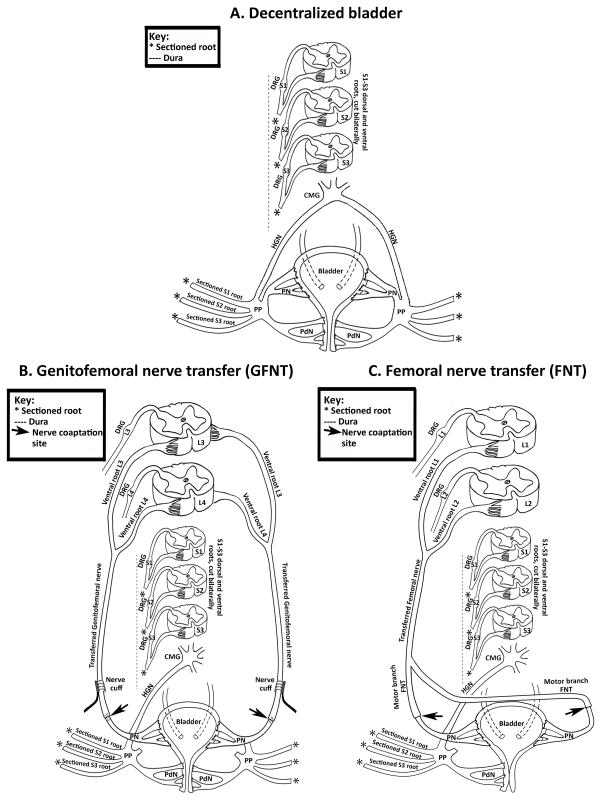 Purpose: We determined whether transfer of a primarily motor nerve (femoral) to the anterior vesicle branch of the pelvic nerve would allow for more effective bladder reinnervation than transfer of a primarily sensory nerve (genitofemoral).