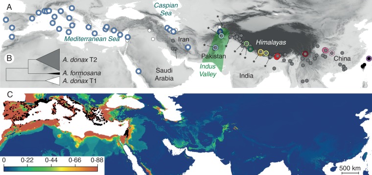 Key results: Despite analysis of several plastid DNA hypervariable sites and the identification of 13 haplotypes, A. donax was represented by a single haplotype from the Mediterranean to the Middle East. This haplotype is shared with invasive samples worldwide, and its nearest phylogenetic relatives are located in the Middle East. Morphometric data characterized this invasive clone by a robust morphotype distinguishable from all other Asian samples. The ecological niche modelling designated the southern Caspian Sea, southern Iran and the Indus Valley as the most suitable regions of origin in Asia for the invasive clone of A. donax.