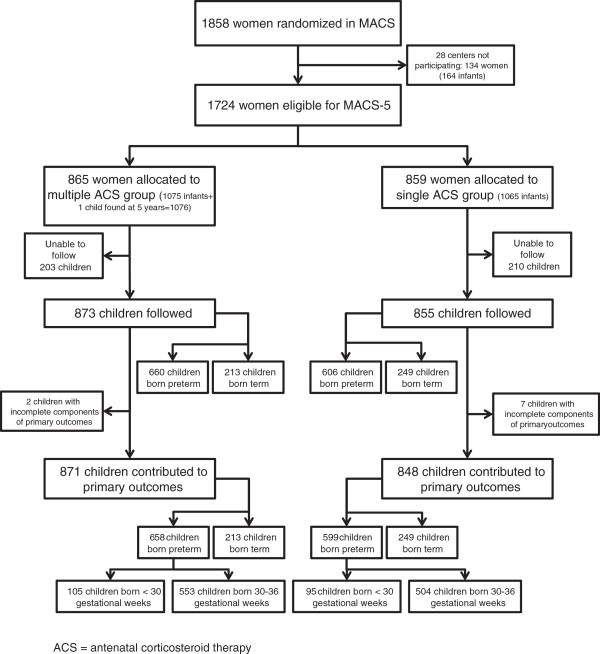 Conclusion: Preterm birth (<37 weeks gestation) remained the primary factor contributing to an adverse outcome regardless of the number of courses of ACS therapy. Children born ≥ 37 weeks and exposed to multiple ACS therapy may have an increased risk of neurodevelopmental/neurosensory impairment by 5 years of age. To optimize outcomes for infants/children, efforts in reducing the incidence of preterm birth should remain the primary focus in perinatal research.