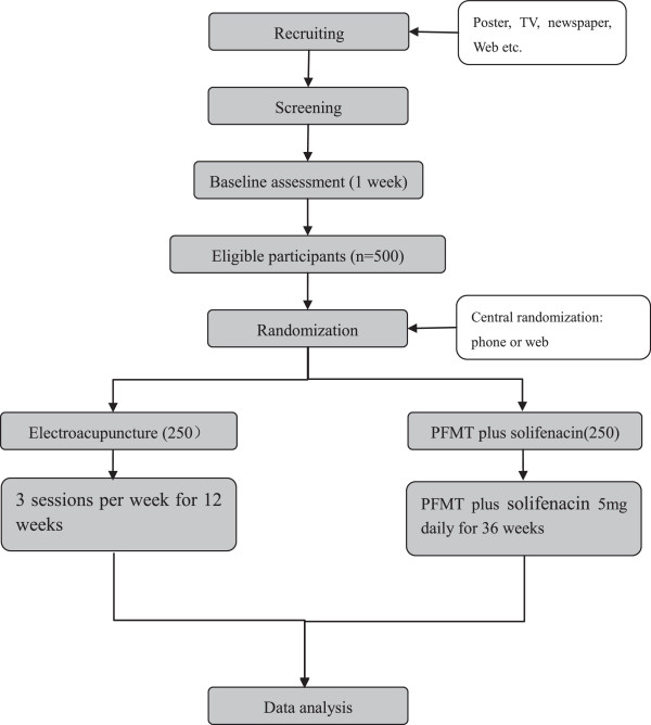 Methods/design: In this prospective, multi-center, randomized controlled trial, five hundred women with mixed urinary incontinence, from 10 centers will be randomized to receive either electroacupuncture or pelvic floor muscle training plus solifenacin. Women in the acupuncture group will receive electroacupuncture for 3 sessions per week, over 12 weeks, while women in the control group will receive pelvic floor muscle training plus solifenacin (5 mg once daily) for 36 weeks. The primary outcome measure is the proportion of change in 72-hour incontinence episode frequency from baseline to week 12. The secondary outcome measures include eleven items, including proportion of participants with ≥50% decrease in average 72-h incontinence episode frequency, change from baseline in the amount of urine leakage and proportion of change from baseline in 72-h incontinence episode frequency in week 25-36, and so forth. Statistical analysis will include covariance analysis, nonparametric tests and t tests.