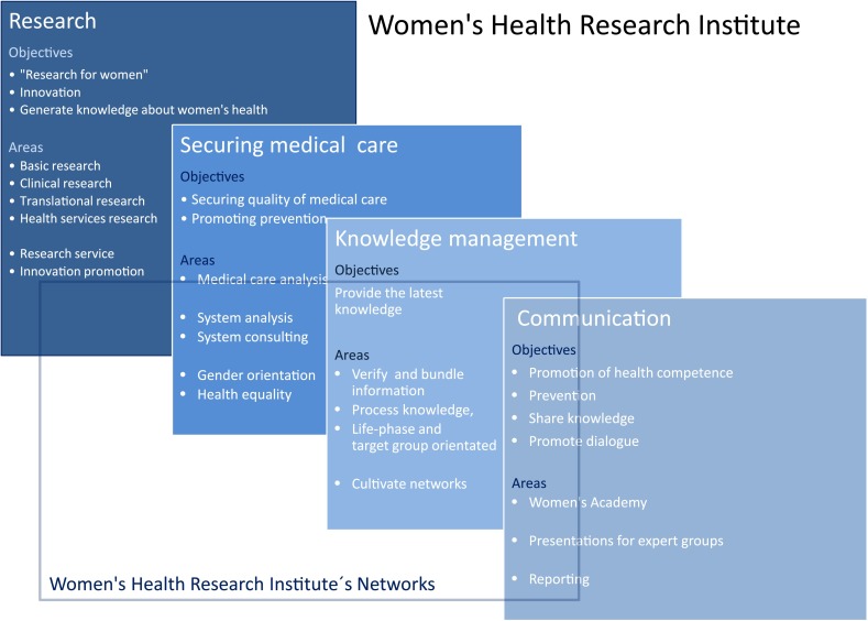 Results: The Department, consisting of a University Hospital and a Research Institute, should interlink clinical care and science. With the establishment of the department, a pool of expertise is achieved which encompasses gynaecology and obstetrics from basic care to the high-technology segments, as well as all the scientific areas relevant to the medical discipline and women's health, including health services research. Preservation and attraction of personnel resources are based on the department's excellence, on reliable perspectives and the flexibility of job profiles, which also result from the close connection between care and research and the expansion of perspectives on women's health.