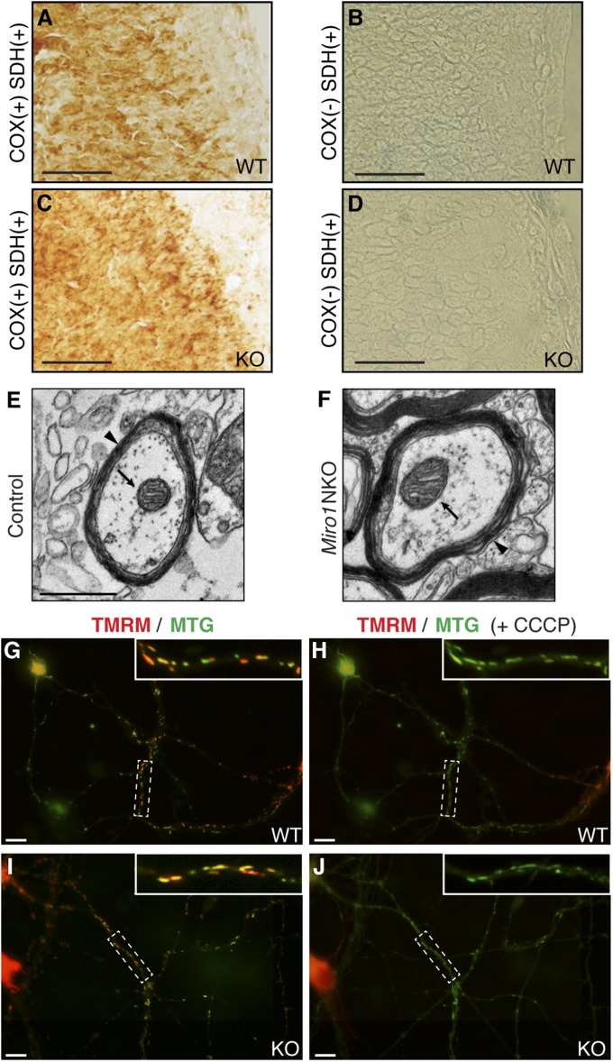Defective mitochondrial distribution in neurons is proposed to cause ATP depletion and calcium-buffering deficiencies that compromise cell function. However, it is unclear whether aberrant mitochondrial motility and distribution alone are sufficient to cause neurological disease. Calcium-binding mitochondrial Rho (Miro) GTPases attach mitochondria to motor proteins for anterograde and retrograde transport in neurons. Using two new KO mouse models, we demonstrate that Miro1 is essential for development of cranial motor nuclei required for respiratory control and maintenance of upper motor neurons required for ambulation. Neuron-specific loss of Miro1 causes depletion of mitochondria from corticospinal tract axons and progressive neurological deficits mirroring human upper motor neuron disease. Although Miro1-deficient neurons exhibit defects in retrograde axonal mitochondrial transport, mitochondrial respiratory function continues. Moreover, Miro1 is not essential for calcium-mediated inhibition of mitochondrial movement or mitochondrial calcium buffering. Our findings indicate that defects in mitochondrial motility and distribution are sufficient to cause neurological disease.