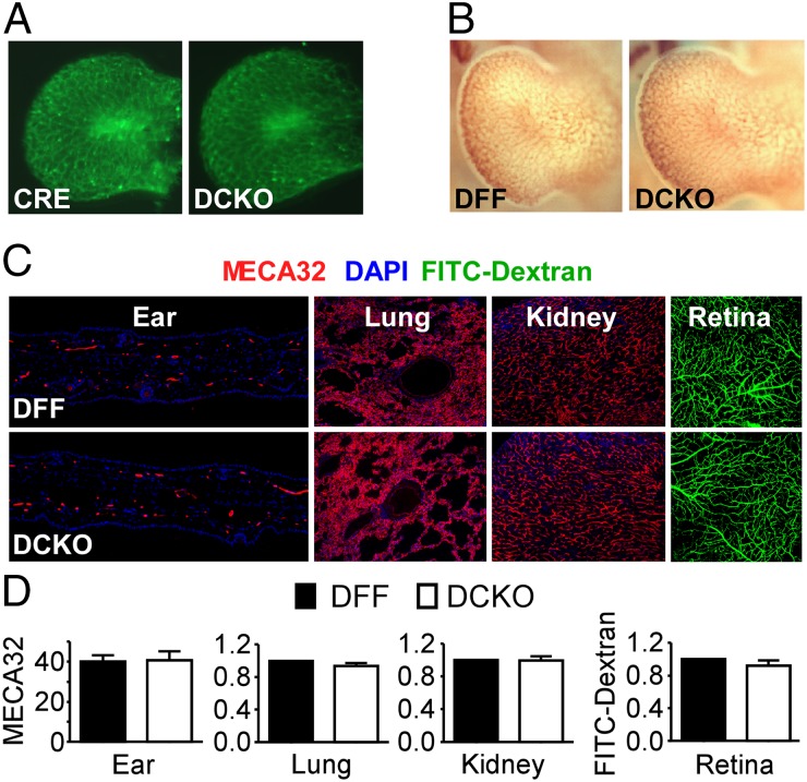 Endothelial cells (ECs) express fibroblast growth factor receptors (FGFRs) and are exquisitely sensitive to FGF signals. However, whether the EC or another vascular cell type requires FGF signaling during development, homeostasis, and response to injury is not known. Here, we show that Flk1-Cre or Tie2-Cre mediated deletion of FGFR1 and FGFR2 (Fgfr1/2(Flk1-Cre) or Fgfr1/2(Tie2-Cre) mice), which results in deletion in endothelial and hematopoietic cells, is compatible with normal embryonic development. As adults, Fgfr1/2(Flk1-Cre) mice maintain normal blood pressure and vascular reactivity and integrity under homeostatic conditions. However, neovascularization after skin or eye injury was significantly impaired in both Fgfr1/2(Flk1-Cre) and Fgfr1/2(Tie2-Cre) mice, independent of either hematopoietic cell loss of FGFR1/2 or vascular endothelial growth factor receptor 2 (Vegfr2) haploinsufficiency. Also, impaired neovascularization was associated with delayed cutaneous wound healing. These findings reveal a key requirement for cell-autonomous EC FGFR signaling in injury-induced angiogenesis, but not for vascular homeostasis, identifying the EC FGFR signaling pathway as a target for diseases associated with aberrant vascular proliferation, such as age-related macular degeneration, and for modulating wound healing without the potential toxicity associated with direct manipulation of systemic FGF or VEGF activity.