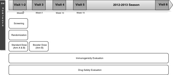 Methods/design: This phase III, randomized, controlled, open-label clinical trial was conducted between October 2012 and December 2013 in 12 Spanish public referral hospitals. Solid organ transplant recipients (liver, kidney, heart or lung), older than 16 years of age more than 30 days after transplantation were eligible to participate. Patients (N = 514) were stratified 1:1 by center, type of organ and time after transplantation and who either received the standard single dose (n = 257) or were treated according to a novel influenza vaccination schedule comprising the administration of a booster dose 5 weeks after standard vaccination (n = 254). Seroconversion rates were measured as a determinant of protection against influenza (main outcome). Efficacy and safety outcomes were followed until 1 year after influenza vaccination with assessment of short-term (0, 5, 10 and 15 weeks) and long-term (12 months) results. Intention-to-treat, per-protocol and safety analyses will be performed.