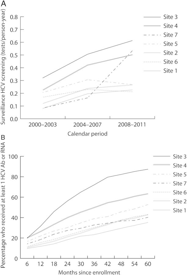 Results: Among 17 090 patients registered at CNICS sites between 2000 and 2011, 14 534 (85%) received HCV antibody screening within 3 months of enrolling in care, and 9077 met all of the inclusion criteria. Only 55.6% ever received additional HCV screening. HCV screening increased over time, but not uniformly at all sites. Only 26.7% of first-time ALT elevations to >100 IU/L were followed up within 12 months by HCV antibody or RNA testing.