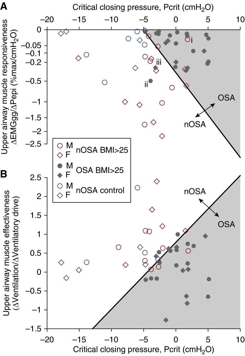 Methods: We compared key physiologic traits in 18 overweight/obese subjects without apnea (apnea-hypopnea index < 15 events per hour) with 25 overweight/obese matched patients with OSA (apnea-hypopnea index ≥ 15 events per hour) and 11 normal-weight nonapneic control subjects. Traits were measured by repeatedly lowering continuous positive airway pressure to subtherapeutic levels for 3 minutes during non-REM sleep.
