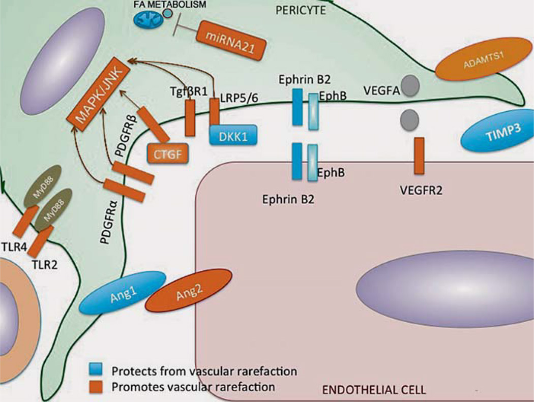 Background: Pericytes surround endothelial cells at the perivascular interface. Signaling between endothelial cells and pericytes is crucial for capillary homeostasis, as pericytes stabilize vessels and regulate many microvascular functions. Recently it has been shown that pericytes are able to detach from the vascular wall and contribute to fibrosis by becoming scar-forming myofibroblasts in many organs including the kidney. At the same time, the loss of pericytes within the perivascular compartment results in vulnerable capillaries which are prone to instability, pathological angiogenesis, and, ultimately, rarefaction.