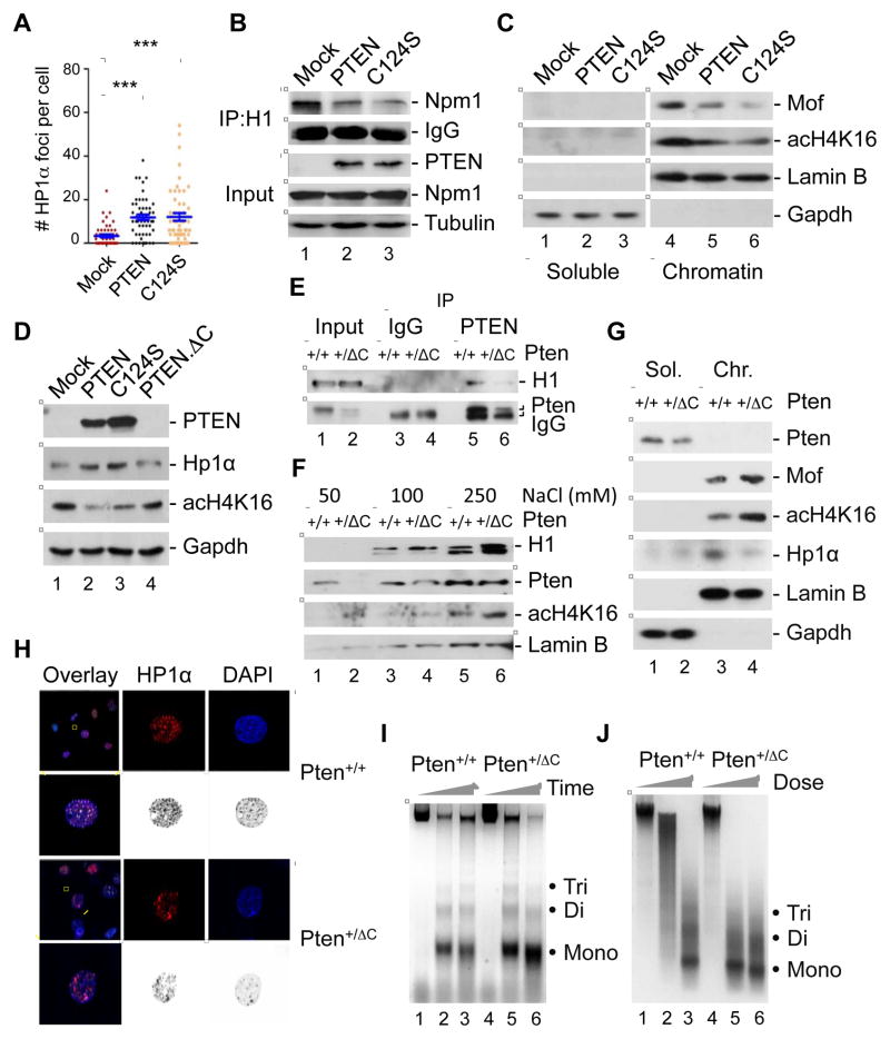 Chromatin organization and dynamics are integral to global gene transcription. Histone modification influences chromatin status and gene expression. PTEN plays multiple roles in tumor suppression, development, and metabolism. Here, we report on the interplay of PTEN, histone H1, and chromatin. We show that loss of PTEN leads to dissociation of histone H1 from chromatin and decondensation of chromatin. PTEN deletion also results in elevation of histone H4 acetylation at lysine 16, an epigenetic marker for chromatin activation. We found that PTEN and histone H1 physically interact through their C-terminal domains. Disruption of the PTEN C terminus promotes the chromatin association of MOF acetyltransferase and induces H4K16 acetylation. Hyperacetylation of H4K16 impairs the association of PTEN with histone H1, which constitutes regulatory feedback that may reduce chromatin stability. Our results demonstrate that PTEN controls chromatin condensation, thus influencing gene expression. We propose that PTEN regulates global gene transcription profiling through histones and chromatin remodeling.