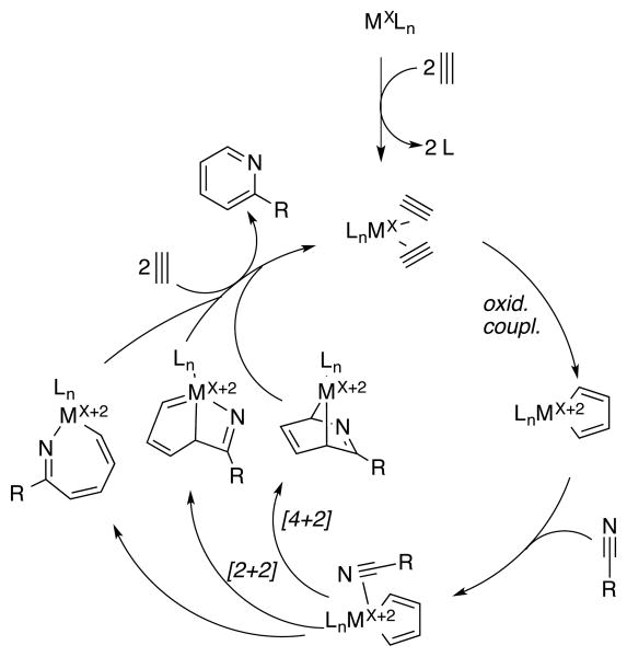 For leading sources for Co-catalyzed systems see: Vollhardt KPC. Angew Chem. 1984;96:525.. Bönnemann H. Angew Chem Int Ed Engl. 1985;24:248.. Bönnemann H, Brijoux W. Adv Heterocycl Chem. 1990;48:177.. Garcia P, Evanno Y, George P, Sevrin M, Ricci M, Malacria M, Aubert C, Gandon V. Chem Eur J. 2012;18:4337.. For Ru-systems: Yamamoto Y, Ogawa R, Itoh K. J Am Chem Soc. 2001;123:6189.. Varela JA, Castedo L, Saa C. J Org Chem. 2003;68:8595.. Yamamoto Y, Kinpara K, Saigoku T, Takagishi H, Okuda S, Nishiyama H, Itoh K. J Am Chem Soc. 2005;127:605.. Calhorda MJ, Costa PJ, Kirchner KA. Inorg Chem Acta. 2011;374:24.. For Ir-system: Onodera G, Shimizu Y, Kimura JN, Kobayashi J, Ebihara Y, Kondo K, Sakata K, Takeuchi R. J Am Chem Soc. 2012;134:10515.