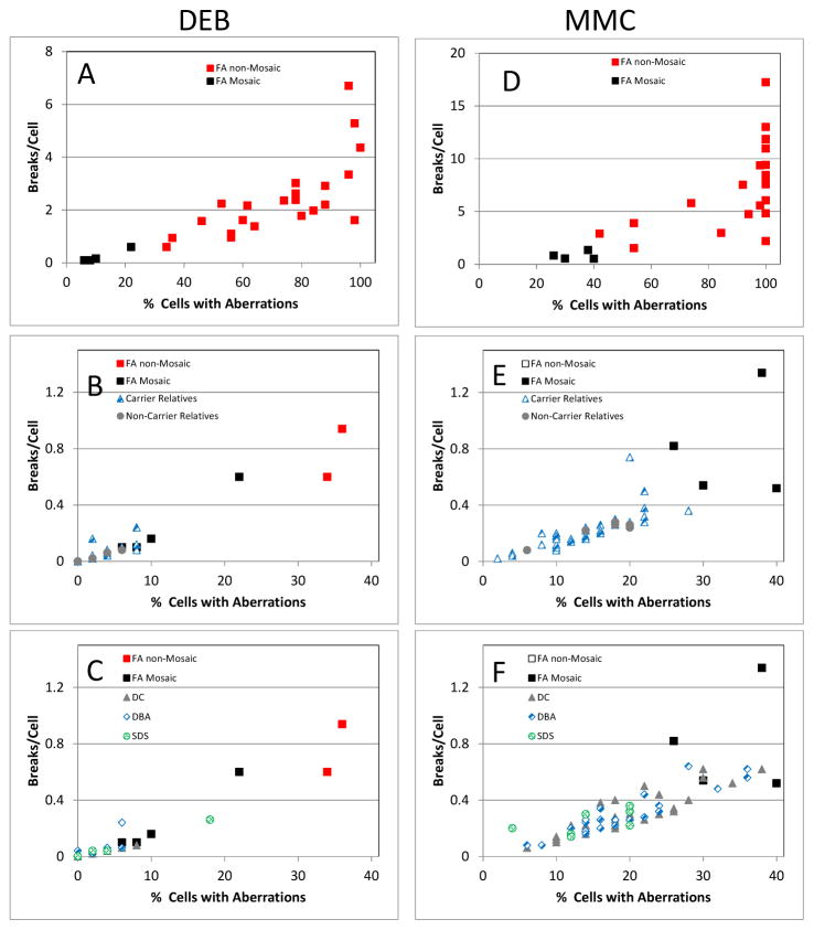Fanconi anemia (FA) is a rare inherited bone marrow failure syndrome (IBMFS). Affected individuals must be distinguished from relatives, patients with mosaicism must be identified, and patients with other IBMFS classified as non-FA. The diagnostic feature of FA is increased chromosomal breakage in blood lymphocytes cultured with diepoxybutane or mitomycin C. Here, we sought a method to uniquely identify patients with FA with mosaicism, using cells from participants in the National Cancer Institute IBMFS cohort. Lymphocytes were treated with diepoxybutane or mitomycin C, and metaphases scored for breaks and radials. Analyses included the percentage of cells with any aberration, breaks per cell, and breaks per aberrant cell. There were 26 patients with FA (4 mosaics), 46 FA relatives, and 62 patients with a non-FA IBMFS. By all analytic methods, patients with FA were abnormal compared with other groups. Those with FA mosaicism had more breakage than relatives or patients with non-FA IBMFS, but there was some individual overlap. The choices of clastogen are laboratory-dependent, but there was no method or analysis of lymphocytes that clearly distinguished all individuals mosaic for FA from relatives or patients with other IBMFS. Thus, genotyping remains the best method for providing absolute clarity.