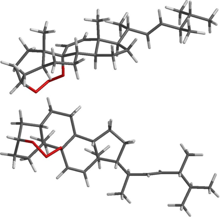 A new natural product, a 3,9-(1,2,3-trioxocine)-type steroid, named rauianodoxy (6), was isolated from Rauia nodosa, together with five steroids: sistostenone (1), stigmastenone (2), sitosterol (3), stigmasterol (4) and ergosterol peroxide (5), one coumarin, O-geranylosthenol (7), and three alkaloids, N-methylflindersine (8), zantobungeanine (9) and veprissine (10). Compounds 5-8 were isolated for the first time in the genus Rauia. These compounds were characterized on the basis of their spectral data, mainly one and two-dimensional NMR, and mass spectra, also involving comparison with the literature data. Theoretical studies at the DFT level reveal structural parameters for the 1,2,3-trioxole bridge compatible with known structures containing a similar group.