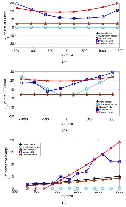 The stochastic error characteristics of the Kinect sensing device are presented for each axis direction. Depth (z) directional error is measured using a flat surface, and horizontal (x) and vertical (y) errors are measured using a novel 3D checkerboard. Results show that the stochastic nature of the Kinect measurement error is affected mostly by the depth at which the object being sensed is located, though radial factors must be considered, as well. Measurement and statistics-based models are presented for the stochastic error in each axis direction, which are based on the location and depth value of empirical data measured for each pixel across the entire field of view. The resulting models are compared against existing Kinect error models, and through these comparisons, the proposed model is shown to be a more sophisticated and precise characterization of the Kinect error distributions.