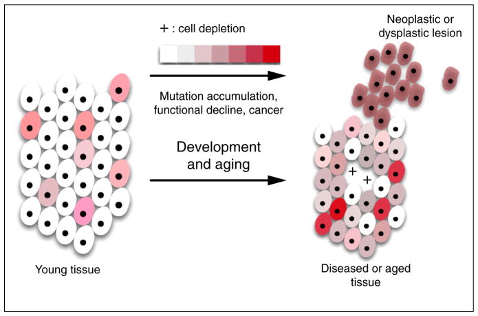 Genomes are inherently unstable due to the need for DNA sequence variation in the germ line to fuel evolution through natural selection. In somatic tissues mutations accumulate during development and aging, generating genome mosaics. There is little information about the possible causal role of increased somatic mutation loads in late-life disease and aging, with the exception of cancer. Characterizing somatic mutations and their functional consequences in normal tissues remains a formidable challenge due to their low, individual abundance. Here, I will briefly review our current knowledge of somatic mutations in animals and humans in relation to aging, how they arise and lead to genome mosaicism, the technology to study somatic mutations and how they possibly could cause non-clonal disease.