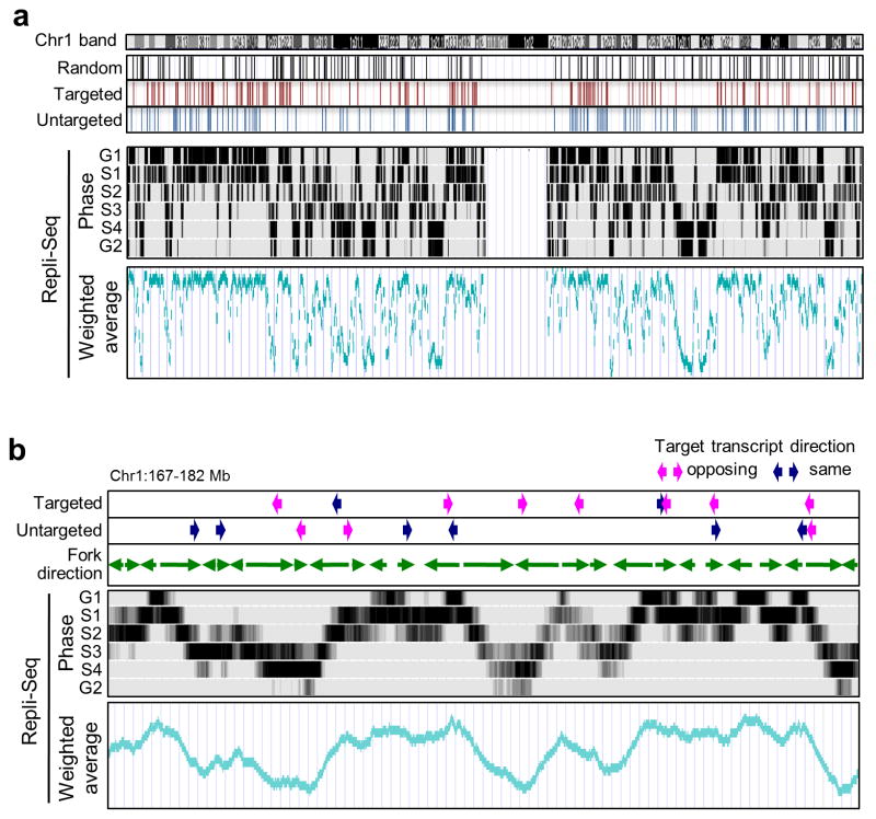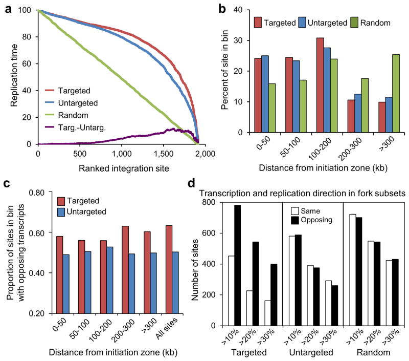 To determine which genomic features promote homologous recombination, we created a genome-wide map of gene targeting sites. We used an adeno-associated virus vector to target identical loci introduced as transcriptionally active retroviral vectors. A comparison of ~2,000 targeted and untargeted sites showed that targeting occurred throughout the human genome and was not influenced by the presence of nearby CpG islands, sequence repeats or DNase I-hypersensitive sites. Targeted sites were preferentially located within transcription units, especially when the target loci were transcribed in the opposite orientation to their surrounding chromosomal genes. We determined the impact of DNA replication by mapping replication forks, which revealed a preference for recombination at target loci transcribed toward an incoming fork. Our results constitute the first genome-wide screen of gene targeting in mammalian cells and demonstrate a strong recombinogenic effect of colliding polymerases.