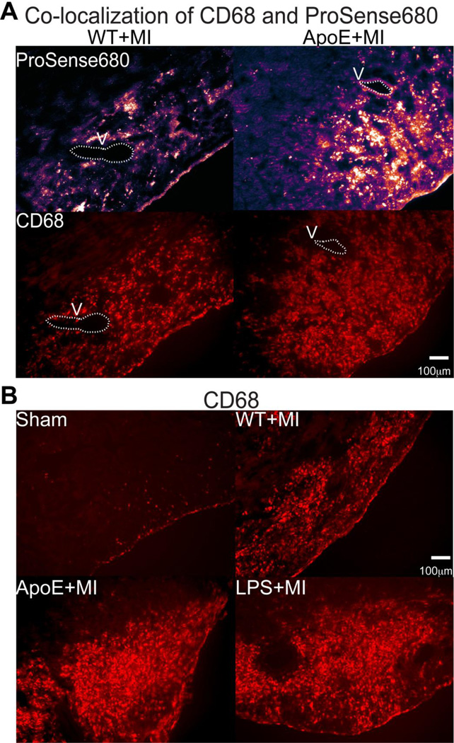 Results: Inflammatory activity (Prosense680 fluorescence) was increased approximately 2-fold in ApoE+MI and LPS+MI hearts vs WT+MI (P<.05) and 3-fold vs sham (P<.05). ApoE+MI and LPS+MI hearts also had prolonged action potential duration, slowed conduction velocity, and increased susceptibility to pacing-induced arrhythmias (56% and 71% vs 13% for WT+MI and 0% for sham, respectively, P<.05, for ApoE+MI and LPS+MI groups vs both WT+MI and sham). Increased macrophage accumulation in ApoE+MI and LPS+MI hearts was confirmed by immunofluorescence. Macrophages were associated with areas of connexin43 (Cx43) degradation, and a 2-fold decrease in Cx43 expression was found in ApoE+MI vs WT+MI hearts (P<.05). ApoE+MI hearts also had a 3-fold increase in interleukin-1β expression, an inflammatory cytokine known to degrade Cx43.