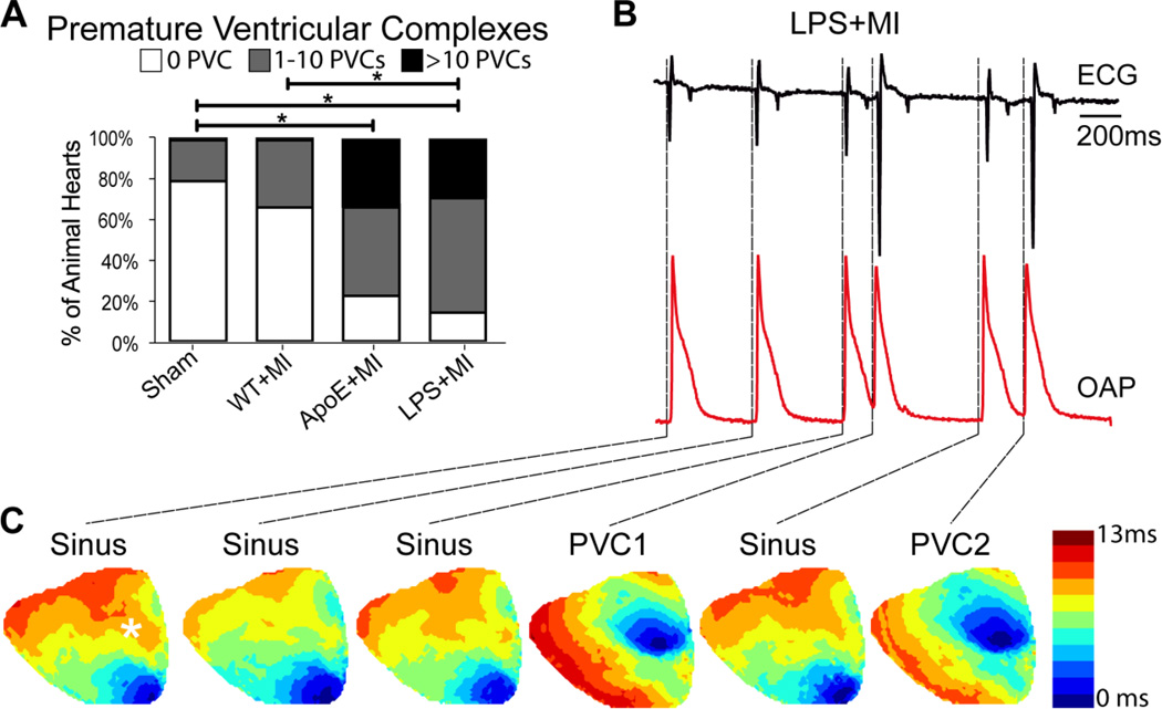 Conclusion: Underlying atherosclerosis exacerbates post-MI electrophysiological remodeling and arrhythmias. LPS+MI hearts fully recapitulate the atherosclerotic phenotype, suggesting myocardial inflammation as a key contributor to post-MI arrhythmia.