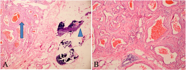 Histological features. (A) The channels that are dilated vessels with endothelial cells contained red blood cells (arrow) and a thymic corpuscle (arrowhead) is observed. (H & E 40×). (B) Section reveals dilated vessels with endothelial cells. Most of the channels contained red blood cells in the cavity thrombus. (H & E 200×).