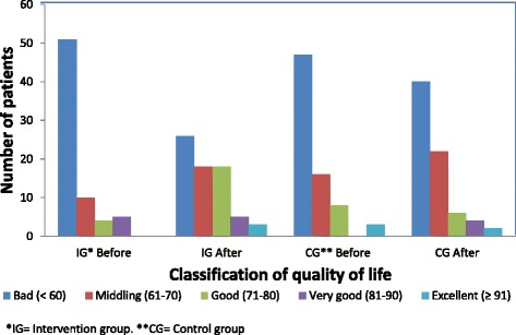 Conclusiones: El estudio demostró que la aplicación del programa de AF mejora significativamente la CVRS en MCE. El NNT encontrado nos permite recomendar la implementación del programa de AF por el beneficio adicional que se obtendría en la CVRS de los pacientes.