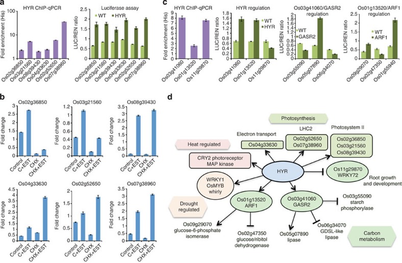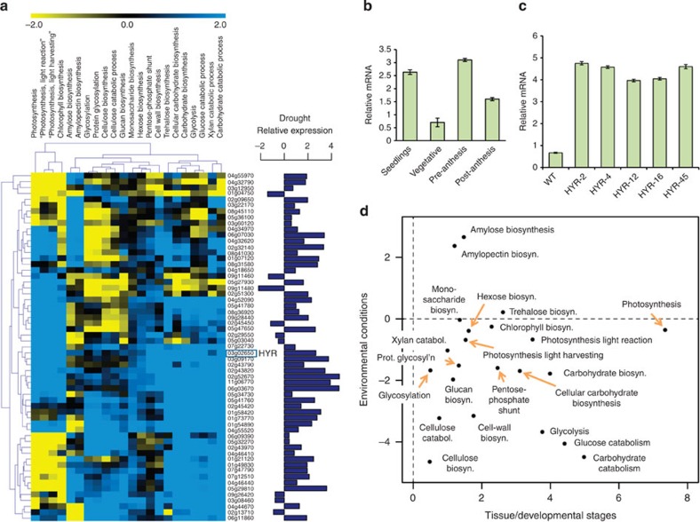 Plants capture solar energy and atmospheric carbon dioxide (CO2) through photosynthesis, which is the primary component of crop yield, and needs to be increased considerably to meet the growing global demand for food. Environmental stresses, which are increasing with climate change, adversely affect photosynthetic carbon metabolism (PCM) and limit yield of cereals such as rice (Oryza sativa) that feeds half the world. To study the regulation of photosynthesis, we developed a rice gene regulatory network and identified a transcription factor HYR (HIGHER YIELD RICE) associated with PCM, which on expression in rice enhances photosynthesis under multiple environmental conditions, determining a morpho-physiological programme leading to higher grain yield under normal, drought and high-temperature stress conditions. We show HYR is a master regulator, directly activating photosynthesis genes, cascades of transcription factors and other downstream genes involved in PCM and yield stability under drought and high-temperature environmental stress conditions.