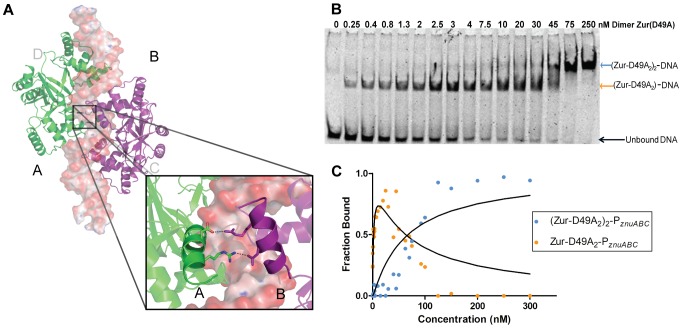 Commensal microbes, whether they are beneficial or pathogenic, are sensitive to host processes that starve or swamp the prokaryote with large fluctuations in local zinc concentration. To understand how microorganisms coordinate a dynamic response to changes in zinc availability at the molecular level, we evaluated the molecular mechanism of the zinc-sensing zinc uptake regulator (Zur) protein at each of the known Zur-regulated genes in Escherichia coli. We solved the structure of zinc-loaded Zur bound to the P(znuABC) promoter and show that this metalloregulatory protein represses gene expression by a highly cooperative binding of two adjacent dimers to essentially encircle the core element of each of the Zur-regulated promoters. Cooperativity in these protein-DNA interactions requires a pair of asymmetric salt bridges between Arg52 and Asp49' that connect otherwise independent dimers. Analysis of the protein-DNA interface led to the discovery of a new member of the Zur-regulon: pliG. We demonstrate this gene is directly regulated by Zur in a zinc responsive manner. The pliG promoter forms stable complexes with either one or two Zur dimers with significantly less protein-DNA cooperativity than observed at other Zur regulon promoters. Comparison of the in vitro Zur-DNA binding affinity at each of four Zur-regulon promoters reveals ca. 10,000-fold variation Zur-DNA binding constants. The degree of Zur repression observed in vivo by comparison of transcript copy number in wild-type and Δzur strains parallels this trend spanning a 100-fold difference. We conclude that the number of ferric uptake regulator (Fur)-family dimers that bind within any given promoter varies significantly and that the thermodynamic profile of the Zur-DNA interactions directly correlates with the physiological response at different promoters.