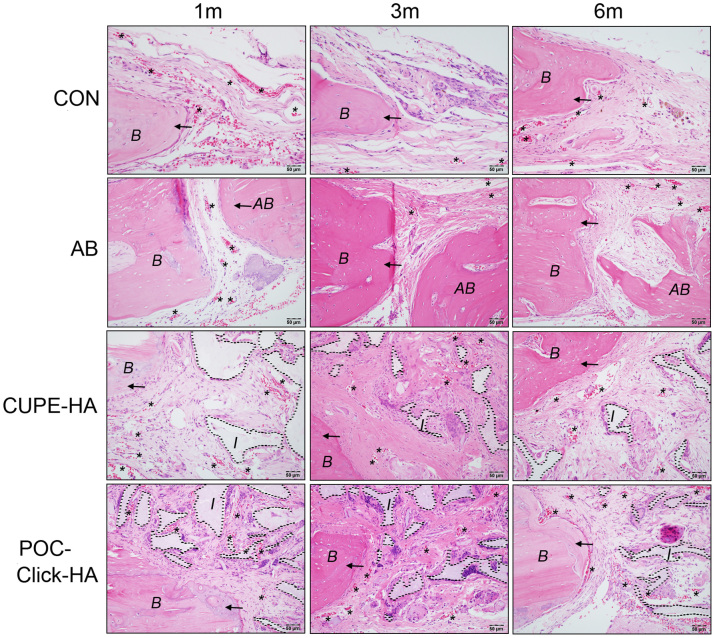 Citric acid-based polymer/hydroxyapatite composites (CABP-HAs) are a novel class of biomimetic composites that have recently attracted significant attention in tissue engineering. The objective of this study was to compare the efficacy of using two different CABP-HAs, poly (1,8-octanediol citrate)-click-HA (POC-Click-HA) and crosslinked urethane-doped polyester-HA (CUPE-HA) as an alternative to autologous tissue grafts in the repair of skeletal defects. CABP-HA disc-shaped scaffolds (65 wt.-% HA with 70% porosity) were used as bare implants without the addition of growth factors or cells to renovate 4 mm diameter rat calvarial defects (n = 72, n = 18 per group). Defects were either left empty (negative control group), or treated with CUPE-HA scaffolds, POC-Click-HA scaffolds, or autologous bone grafts (AB group). Radiological and histological data showed a significant enhancement of osteogenesis in defects treated with CUPE-HA scaffolds when compared to POC-Click-HA scaffolds. Both, POC-Click-HA and CUPE-HA scaffolds, resulted in enhanced bone mineral density, trabecular thickness, and angiogenesis when compared to the control groups at 1, 3, and 6 months post-trauma. These results show the potential of CABP-HA bare implants as biocompatible, osteogenic, and off-shelf-available options in the repair of orthopedic defects.