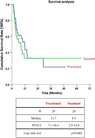 Materials and methods: Between 2001 and March 2013, a total of 214 patients with metastatic GIST was treated at Chang Gung Memorial Hospital. Among them, 55 (11.6%) patients who received sunitinib were investigated. One group of patients was administered with standard dose of once-daily sunitinib (standard dose group) and the other group was administered with standard total daily dose of sunitinib in fractioned doses (fractioned dose group).