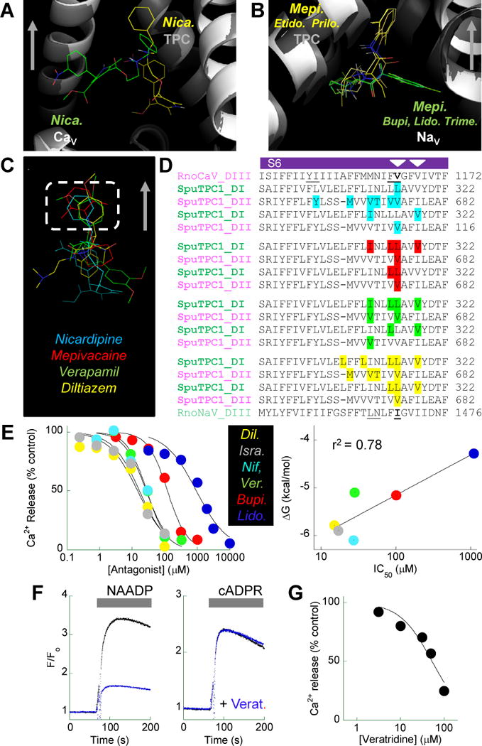 Four-domain voltage-gated Ca(2+) and Na(+) channels (CaV, NaV) underpin nervous system function and likely emerged upon intragenic duplication of a primordial two-domain precursor. To investigate if two-pore channels (TPCs) may represent an intermediate in this evolutionary transition, we performed molecular docking simulations with a homology model of TPC1, which suggested that the pore region could bind antagonists of CaV or NaV. CaV or NaV antagonists blocked NAADP (nicotinic acid adenine dinucleotide phosphate)-evoked Ca(2+) signals in sea urchin egg preparations and in intact cells that overexpressed TPC1. By sequence analysis and inspection of the model, we predicted a noncanonical selectivity filter in animal TPCs in which the carbonyl groups of conserved asparagine residues are positioned to coordinate cations. In contrast, a distinct clade of TPCs [TPCR (for TPC-related)] in several unicellular species had ion selectivity filters with acidic residues more akin to CaV. TPCRs were predicted to interact strongly with CaV antagonists. Our data suggest that acquisition of a "blueprint" pharmacological profile and changes in ion selectivity within four-domain voltage-gated ion channels may have predated intragenic duplication of an ancient two-domain ancestor.