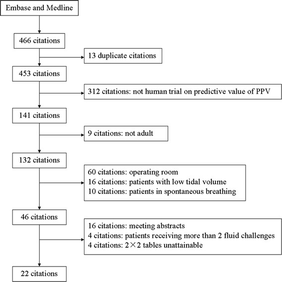 Methods: We searched MEDLINE and EMBASE and included clinical trials that evaluated the association between PPV and fluid responsiveness after fluid challenge in mechanically ventilated patients in intensive care units. Data were synthesized using an exact binomial rendition of the bivariate mixed-effects regression model modified for synthesis of diagnostic test data.