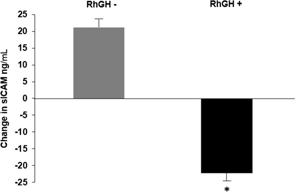 Results: After 6-months, the rhGH group maintained IGF-1 levels, and had decreases in total cholesterol (p = 0.03), sICAM-1 (p = 0.04) and HbA1C (p = 0.03) compared to placebo/no treatment. The rhGH group trended towards greater decreases in LDL and 2-hour OGTT glucose. Glucose tolerance did not worsen with rhGH administration.