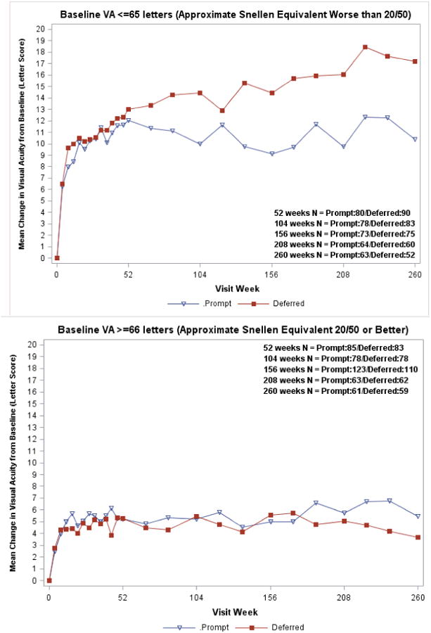 Results: The mean change in visual acuity letter score from baseline to the 5-year visit was +7.2 letters in the prompt laser group compared with +9.8 letters in the deferred laser group (mean difference, -2.6 letters; 95% confidence interval, -5.5 to +0.4 letters; P = 0.09). At the 5-year visit in the prompt versus deferred laser groups, there was vision loss of ≥10 letters in 9% versus 8%, an improvement of ≥10 letters in 46% versus 58%, and an improvement of ≥15 letters in 27% versus 38% of participants, respectively. From baseline to 5 years, 56% of participants in the deferred group did not receive laser. The median number of injections was 13 versus 17 in the prompt and deferral groups, including 54% and 45% receiving no injections during year 4 and 62% and 52% receiving no injections during year 5, respectively.