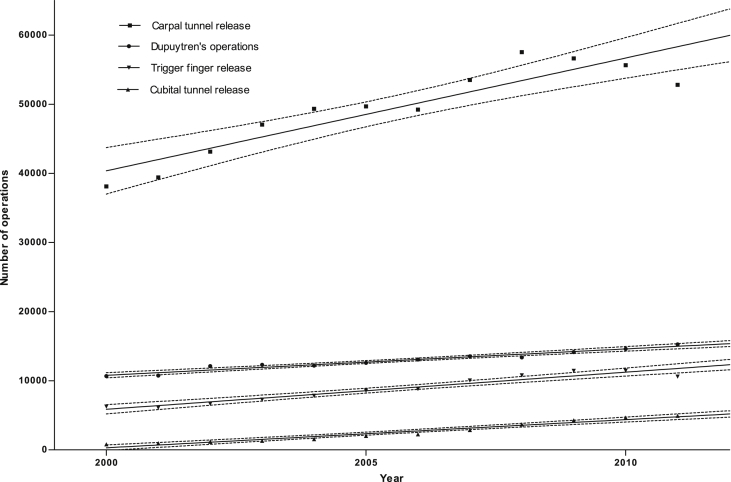 Methods: We analysed Hospital Episode Statistics data for Dupuytren's disease, carpal tunnel syndrome, cubital tunnel syndrome, and trigger finger from 1998 to 2011. Using linear regression, we estimated trends in both diagnosis and surgery until 2030. We integrated this regression with age specific population data from the Office for National Statistics in order to estimate how this will contribute to a change in workload over time.