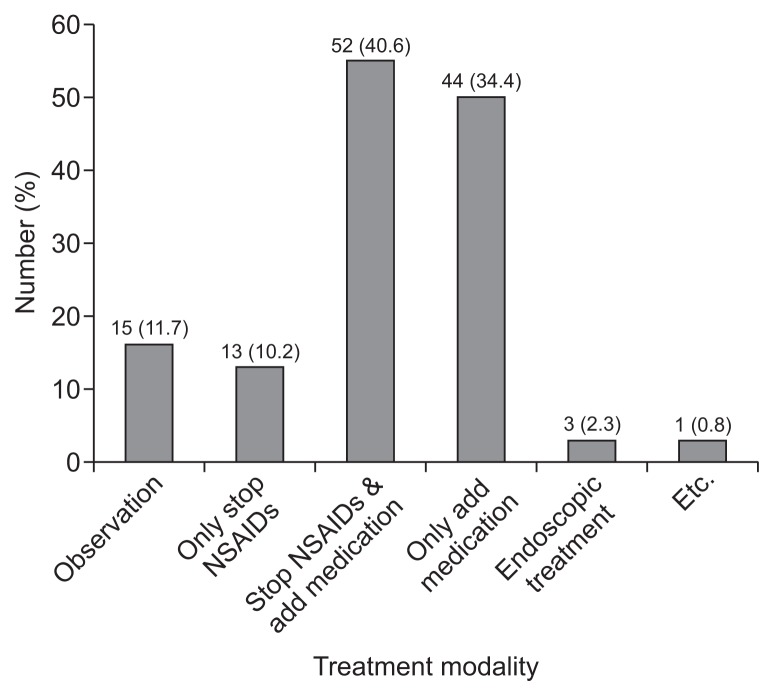 Results: A total of 140 patients (87 males; mean age, 60.6±14.8 years) from the CE nationwide database registry (n=2,885) were diagnosed with NSAID-induced small intestinal injury and enrolled in our study. Forty-nine patients (35.0%) presented with a history of aspirin use and an additional 49 (35.0%) were taking NSAIDs without aspirin. The most prominent findings after performing CE were multiple ulcerations (n=82, 58.6%) and erosions or aphthae (n=32, 22.9%). During the follow-up period (mean, 15.9±19.0 months; range, 0 to 106 months), NSAID-induced small intestinal injury only recurred in six patients (4.3%). Older age and hypertension were positive predictive factors for recurrence.