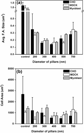 Results: We first checked the viability of cells grown on nanopillars with diameters ranging from 200 nm to 700 nm. It was observed that when cells were cultured on the nanopillars, the apoptosis rate slightly increased as the size of the nanopillar decreased. We then calculated the average size of the focal adhesions and the cell-spreading area for focal adhesions using confocal microscopy. The size of focal adhesions formed on the nanopillars was found to decrease as the size of the nanopillars decreased, resembling the formations of nascent focal complexes. However, when the size of nanopillars decreased to 200 nm, the size of the focal adhesions increased. Further study revealed that cells interacted very strongly with the nanopillars with a diameter of 200 nm and exerted sufficient forces to bend the nanopillars together, resulting in the formation of larger focal adhesions.