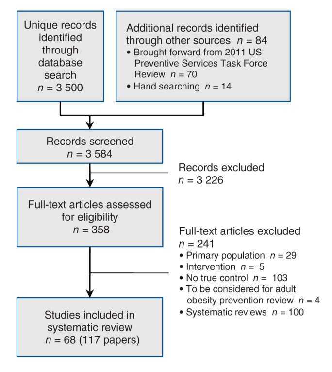 Methods: We updated the search conducted in a previous review. Randomized trials of primary-care-relevant behavioural (diet, exercise and lifestyle) and pharmacologic (orlistat and metformin) with or without behavioural treatments in overweight and obese adults were included if 12-month, postbaseline data were provided for weight outcomes. Studies reporting harms were included regardless of design. Data were extracted and pooled wherever possible for 5 weight outcomes, 6 secondary health outcomes and 4 adverse events categories.