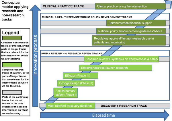 Results: The literature review illustrated the lack of agreement on starting points for measuring time lags. We mapped points from policy documents onto our matrix and thus highlighted key areas of concern, for example around delays before new therapies become widely available. Our seven completed case studies demonstrate we have made considerable progress in developing methods to measure and understand time lags. The matrix of overlapping tracks of activity in the research and implementation processes facilitated analysis of time lags along each track, and at the cross-over points where the next track started. We identified some factors that speed up translation through the actions of companies, researchers, funders, policymakers, and regulators. Recommendations for further work are built on progress made, limitations identified and revised terminology.