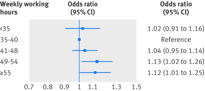 Results: Cross sectional analysis was based on 61 studies representing 333,693 participants from 14 countries. Prospective analysis was based on 20 studies representing 100,602 participants from nine countries. The pooled maximum adjusted odds ratio for the association between long working hours and alcohol use was 1.11 (95% confidence interval 1.05 to 1.18) in the cross sectional analysis of published and unpublished data. Odds ratio of new onset risky alcohol use was 1.12 (1.04 to 1.20) in the analysis of prospective published and unpublished data. In the 18 studies with individual participant data it was possible to assess the European Union Working Time Directive, which recommends an upper limit of 48 hours a week. Odds ratios of new onset risky alcohol use for those working 49-54 hours and ≥ 55 hours a week were 1.13 (1.02 to 1.26; adjusted difference in incidence 0.8 percentage points) and 1.12 (1.01 to 1.25; adjusted difference in incidence 0.7 percentage points), respectively, compared with working standard 35-40 hours (incidence of new onset risky alcohol use 6.2%). There was no difference in these associations between men and women or by age or socioeconomic groups, geographical regions, sample type (population based v occupational cohort), prevalence of risky alcohol use in the cohort, or sample attrition rate.