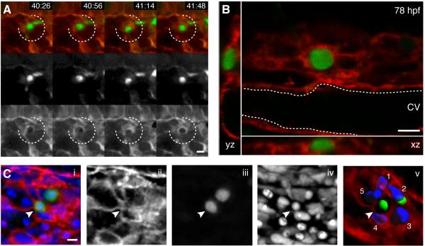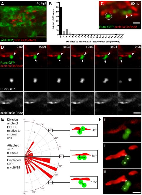 Hematopoietic stem and progenitor cells (HSPCs) can reconstitute and sustain the entire blood system. We generated a highly specific transgenic reporter of HSPCs in zebrafish. This allowed us to perform high-resolution live imaging on endogenous HSPCs not currently possible in mammalian bone marrow. Using this system, we have uncovered distinct interactions between single HSPCs and their niche. When an HSPC arrives in the perivascular niche, a group of endothelial cells remodel to form a surrounding pocket. This structure appears conserved in mouse fetal liver. Correlative light and electron microscopy revealed that endothelial cells surround a single HSPC attached to a single mesenchymal stromal cell. Live imaging showed that mesenchymal stromal cells anchor HSPCs and orient their divisions. A chemical genetic screen found that the compound lycorine promotes HSPC-niche interactions during development and ultimately expands the stem cell pool into adulthood. Our studies provide evidence for dynamic niche interactions upon stem cell colonization. PAPERFLICK:
