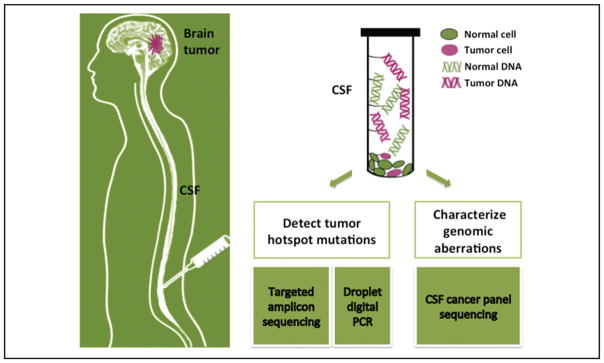 Background: Detecting tumor-derived cell-free DNA (cfDNA) in the blood of brain tumor patients is challenging, presumably owing to the blood-brain barrier. Cerebral spinal fluid (CSF) may serve as an alternative "liquid biopsy" of brain tumors by enabling measurement of circulating DNA within CSF to characterize tumor-specific mutations. Many aspects about the characteristics and detectability of tumor mutations in CSF remain undetermined.