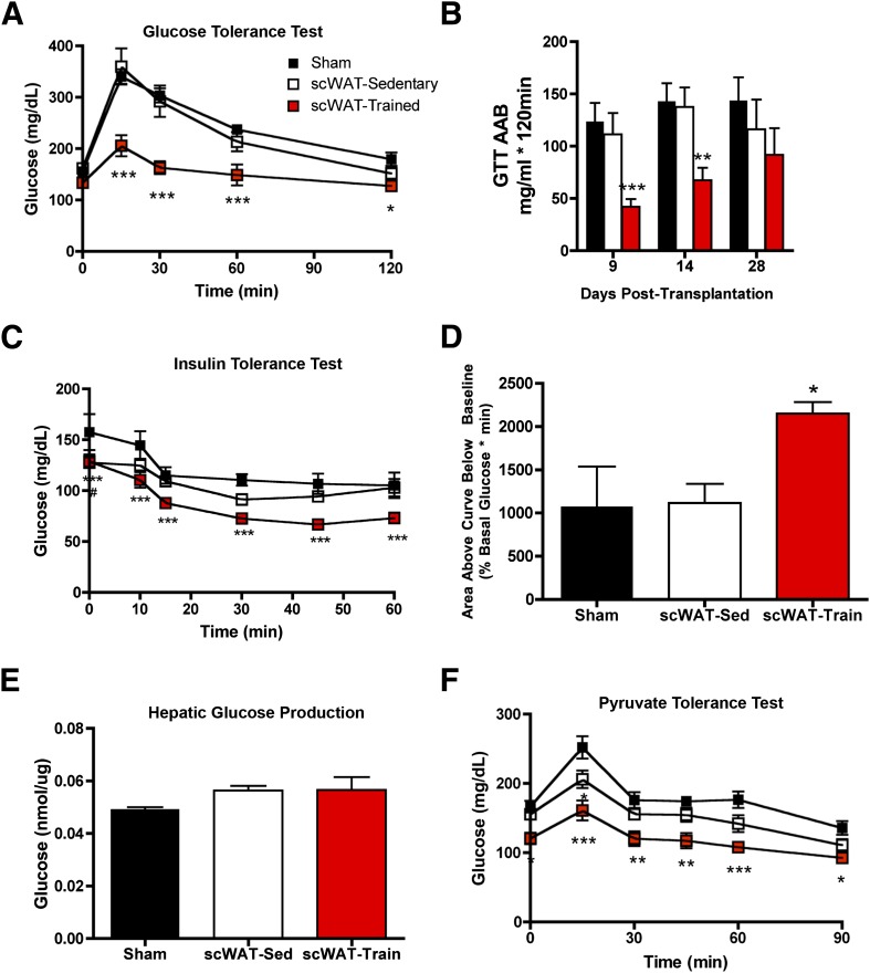 Exercise training improves whole-body glucose homeostasis through effects largely attributed to adaptations in skeletal muscle; however, training also affects other tissues, including adipose tissue. To determine whether exercise-induced adaptations to adipose tissue contribute to training-induced improvements in glucose homeostasis, subcutaneous white adipose tissue (scWAT) from exercise-trained or sedentary donor mice was transplanted into the visceral cavity of sedentary recipients. Remarkably, 9 days post-transplantation, mice receiving scWAT from exercise-trained mice had improved glucose tolerance and enhanced insulin sensitivity compared with mice transplanted with scWAT from sedentary or sham-treated mice. Mice transplanted with scWAT from exercise-trained mice had increased insulin-stimulated glucose uptake in tibialis anterior and soleus muscles and brown adipose tissue, suggesting that the transplanted scWAT exerted endocrine effects. Furthermore, the deleterious effects of high-fat feeding on glucose tolerance and insulin sensitivity were completely reversed if high-fat-fed recipient mice were transplanted with scWAT from exercise-trained mice. In additional experiments, voluntary exercise training by wheel running for only 11 days resulted in profound changes in scWAT, including the increased expression of ∼1,550 genes involved in numerous cellular functions including metabolism. Exercise training causes adaptations to scWAT that elicit metabolic improvements in other tissues, demonstrating a previously unrecognized role for adipose tissue in the beneficial effects of exercise on systemic glucose homeostasis.