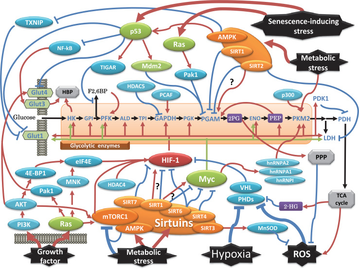 Enhanced glycolysis in cancer, called the Warburg effect, is a well-known feature of cancer metabolism. Recent advances revealed that the Warburg effect is coupled to many other cancer properties, including adaptation to hypoxia and low nutrients, immortalisation, resistance to oxidative stress and apoptotic stimuli, and elevated biomass synthesis. These linkages are mediated by various oncogenic molecules and signals, such as c-Myc, p53, and the insulin/Ras pathway. Furthermore, several regulators of glycolysis have been recently identified as oncogene candidates, including the hypoxia-inducible factor pathway, sirtuins, adenosine monophosphate-activated kinase, glycolytic pyruvate kinase M2, phosphoglycerate mutase, and oncometabolites. The interplay between glycolysis and oncogenic events will be the focus of this review.