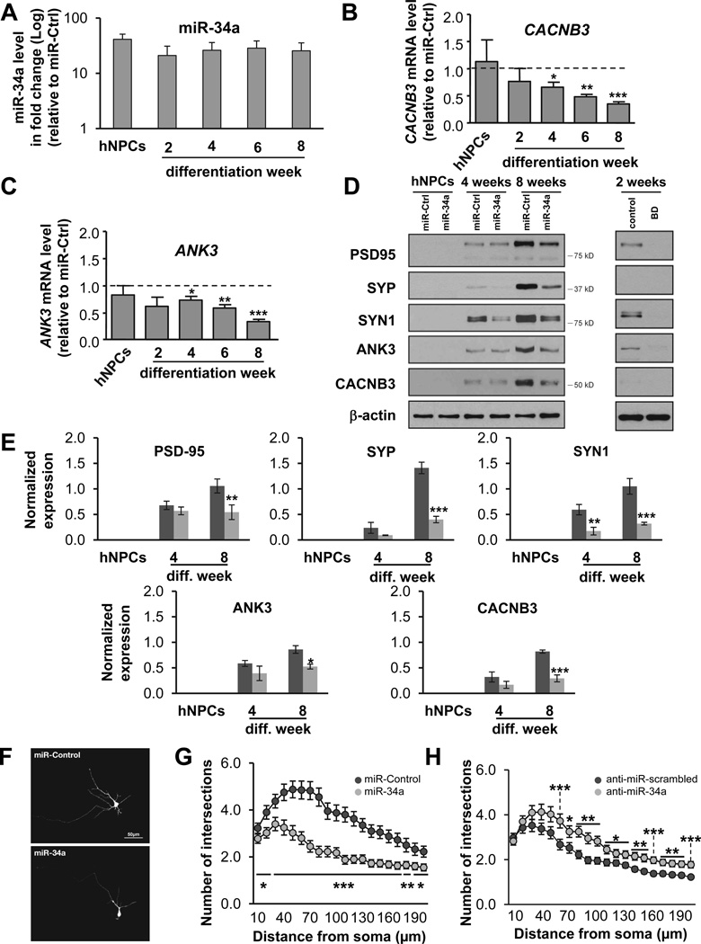 Bipolar disorder (BD) is a heritable neuropsychiatric disorder with largely unknown pathogenesis. Given their prominent role in brain function and disease, we hypothesized that microRNAs (miRNAs) might be of importance for BD. Here we show that levels of miR-34a, which is predicted to target multiple genes implicated as genetic risk factors for BD, are increased in postmortem cerebellar tissue from BD patients, as well as in BD patient-derived neuronal cultures generated by reprogramming of human fibroblasts into induced neurons or into induced pluripotent stem cells (iPSCs) subsequently differentiated into neurons. Of the predicted miR-34a targets, we validated the BD risk genes ankyrin-3 (ANK3) and voltage-dependent L-type calcium channel subunit beta-3 (CACNB3) as direct miR-34a targets. Using human iPSC-derived neuronal progenitor cells, we further show that enhancement of miR-34a expression impairs neuronal differentiation, expression of synaptic proteins and neuronal morphology, whereas reducing endogenous miR-34a expression enhances dendritic elaboration. Taken together, we propose that miR-34a serves as a critical link between multiple etiological factors for BD and its pathogenesis through the regulation of a molecular network essential for neuronal development and synaptogenesis.