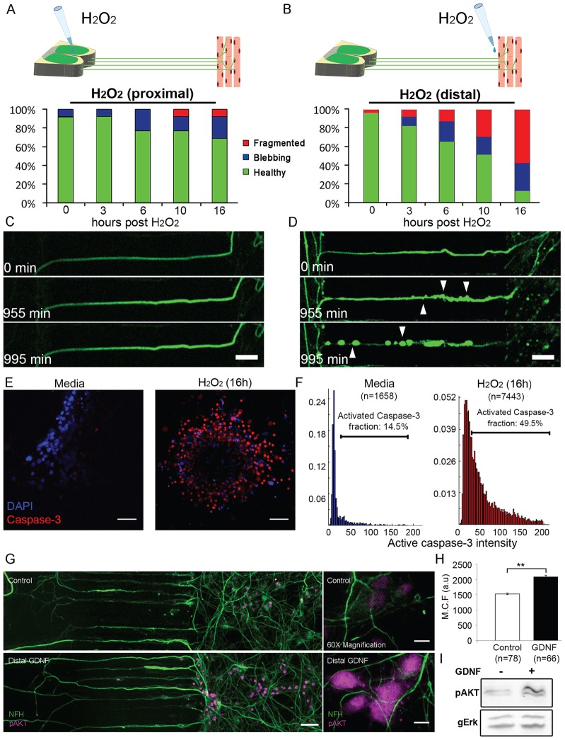 Bidirectional molecular communication between the motoneuron and the muscle is vital for neuromuscular junction (NMJ) formation and maintenance. The molecular mechanisms underlying such communication are of keen interest and could provide new targets for intervention in motoneuron disease. Here, we developed a microfluidic platform with motoneuron cell bodies on one side and muscle cells on the other, connected by motor axons extending through microgrooves to form functional NMJs. Using this system, we were able to differentiate between the proximal and distal effects of oxidative stress and glial-derived neurotrophic factor (GDNF), demonstrating a dying-back degeneration and retrograde transmission of pro-survival signaling, respectively. Furthermore, we show that GDNF acts differently on motoneuron axons versus soma, promoting axonal growth and innervation only when applied locally to axons. Finally, we track for the first time the retrograde transport of secreted GDNF from muscle to neuron. Thus, our data suggests spatially distinct effects of GDNF--facilitating growth and muscle innervation at axon terminals and survival pathways in the soma.