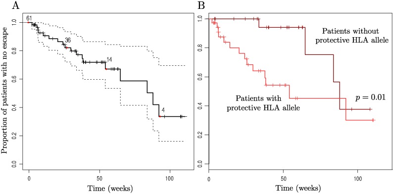 The existence of viral variants that escape from the selection pressures imposed by cytotoxic T-lymphocytes (CTLs) in HIV-1 infection is well documented, but it is unclear when they arise, with reported measures of the time to escape in individuals ranging from days to years. A study of participants enrolled in the SPARTAC (Short Pulse Anti-Retroviral Therapy at HIV Seroconversion) clinical trial allowed direct observation of the evolution of CTL escape variants in 125 adults with primary HIV-1 infection observed for up to three years. Patient HLA-type, longitudinal CD8+ T-cell responses measured by IFN-γ ELISpot and longitudinal HIV-1 gag, pol, and nef sequence data were used to study the timing and prevalence of CTL escape in the participants whilst untreated. Results showed that sequence variation within CTL epitopes at the first time point (within six months of the estimated date of seroconversion) was consistent with most mutations being transmitted in the infecting viral strain rather than with escape arising within the first few weeks of infection. Escape arose throughout the first three years of infection, but slowly and steadily. Approximately one third of patients did not drive any new escape in an HLA-restricted epitope in just under two years. Patients driving several escape mutations during these two years were rare and the median and modal numbers of new escape events in each patient were one and zero respectively. Survival analysis of time to escape found that possession of a protective HLA type significantly reduced time to first escape in a patient (p = 0.01), and epitopes escaped faster in the face of a measurable CD8+ ELISpot response (p = 0.001). However, even in an HLA matched host who mounted a measurable, specific, CD8+ response the average time before the targeted epitope evolved an escape mutation was longer than two years.