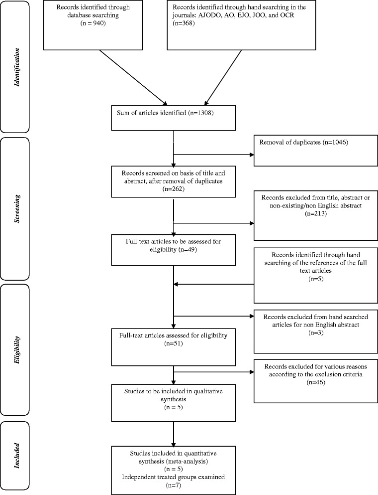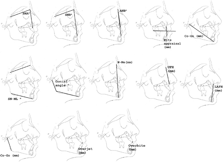 Results: Seven treated groups from five studies (no RCTs, four pCCTs, one OS) were eligible for inclusion, assessing only the short-term occipital pull chin cup effects. In total, 120 treated patients (mean age: 8.5 to 11 years) compared with 64 untreated individuals (mean age: 7.3 to 9.89 years) were assessed by means of 13 cephalometric variables. The overall quality of these studies was low to medium. In comparison to untreated individuals, the SNB and gonial angles decreased significantly following chin cup use, whereas ANB, Wits appraisal, SN-ML, N-Me and overjet increased. For the rest of the variables, no statistically significant differences were detected.