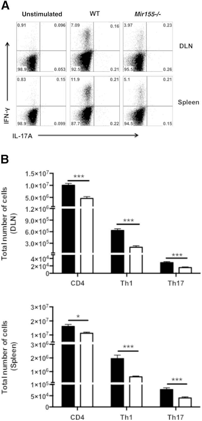 Ocular infection with herpes simplex virus 1 can result in a chronic immunoinflammatory stromal keratitis (SK) lesion that is a significant cause of human blindness. A key to controlling SK lesion severity is to identify cellular and molecular events responsible for tissue damage and to manipulate them therapeutically. Potential targets for therapy are miRNAs, but these are minimally explored especially in responses to infection. Here, we demonstrated that Mir155 expression was up-regulated after ocular herpes simplex virus 1 infection, with the increased Mir155 expression occurring mainly in macrophages and CD4(+) T cells and to a lesser extent in neutrophils. In vivo studies indicated that Mir155 knockout mice were more resistant to herpes SK with marked suppression of T helper cells type 1 and 17 responses both in the ocular lesions and the lymphoid organs. The reduced SK lesion severity was reflected by increased phosphatidylinositol-3,4,5-trisphosphate 5-phosphatase 1 and interferon-γ receptor α-chain levels in activated CD4(+) T cells in the lymph nodes. Finally, in vivo silencing of miR-155 by the provision of antagomir-155 nanoparticles to herpes simplex virus 1-infected mice led to diminished SK lesions and corneal vascularization. In conclusion, our results indicate that miR-155 contributes to the pathogenesis of SK and represents a promising target to control SK severity.