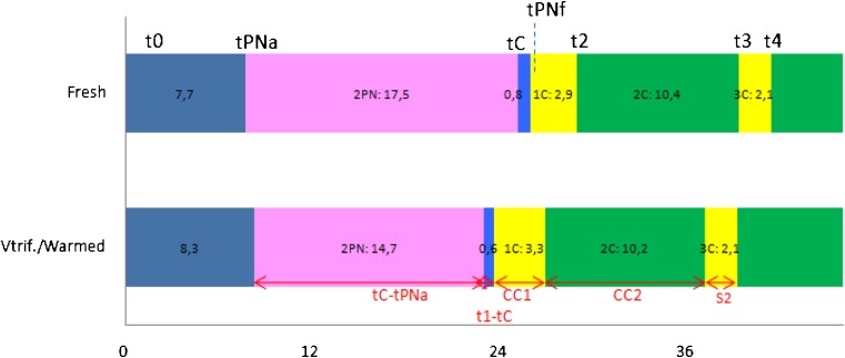 Methods: The embryo-kinetics of fresh and sibling vitrified/warmed oocytes were compared to determine the consequences of oocyte preservation on the timing of embryo development. A 44-hours time-lapse analysis, from the time of ICSI (t0), of 179 fertilized fresh oocytes was compared to 168 fertilized sibling vitrified/warmed oocytes.