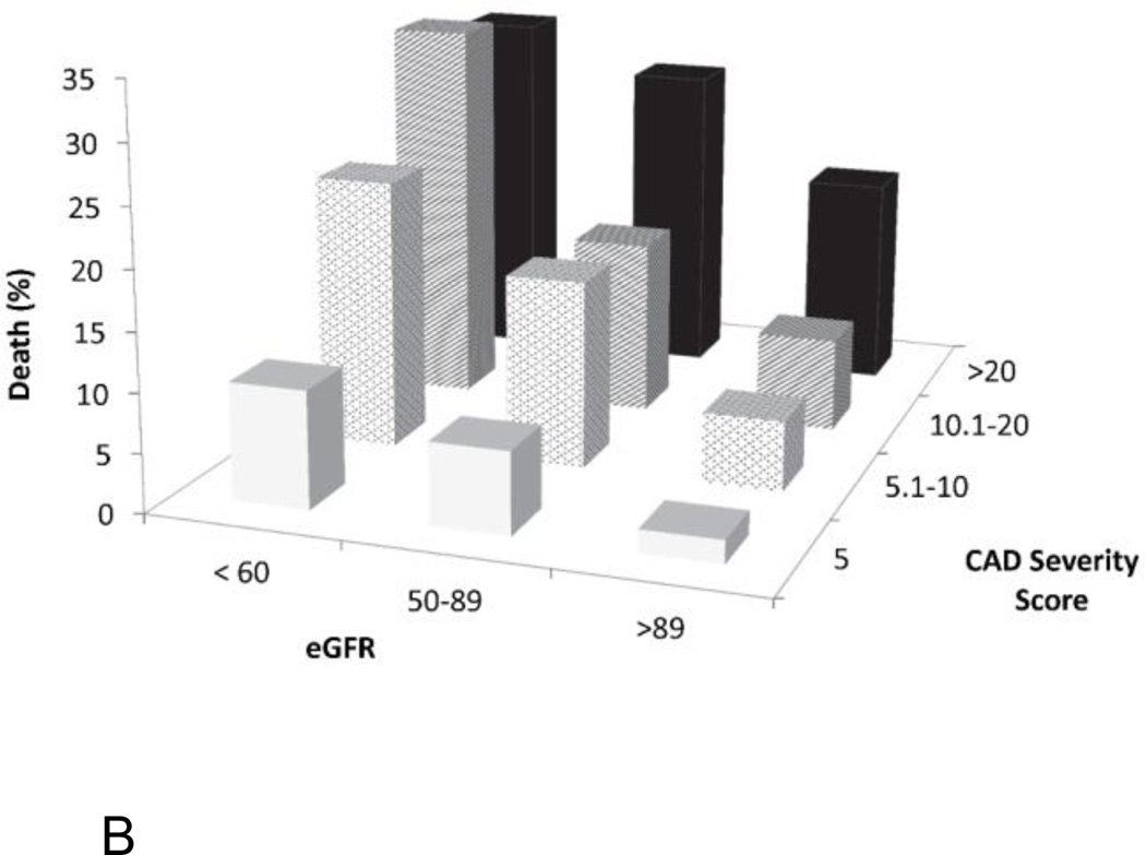Results: Obstructive coronary artery disease (CAD) was present only in few patients (39%). Even after adjusting for CAD severity, renal function remained a strong independent predictor of all-cause and cardiac mortality (P < .001). Every 10-unit decrease in eGFR was associated with a 14% increased risk of all-cause mortality (adjusted hazard ratio [AHR] 1.14 [1.08-1.20], P < .0001), 16% increased risk of cardiovascular mortality (AHR 1.16 [1.09-1.23], P < .0001), and 9% increased risk of adverse cardiovascular events (AHR 1.09 [1.03-1.15], P = .002).