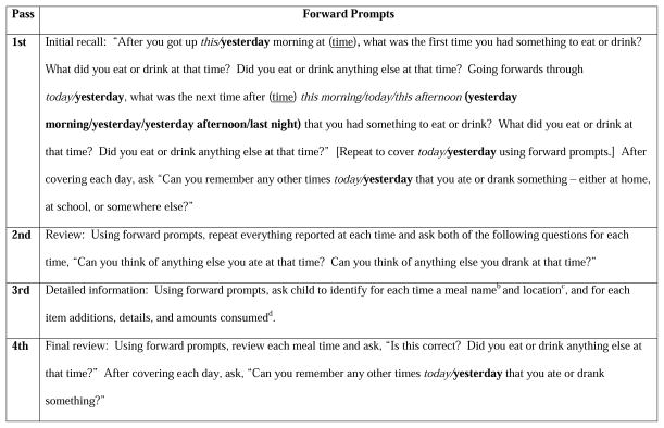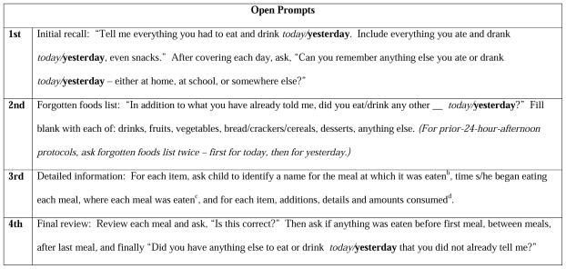 Objective: Eight 24hDR protocols, constructed by crossing two retention intervals (prior-24-hour recall obtained in afternoon and previous-day recall obtained in morning) with four prompts (forward [distant-to-recent], reverse [recent-to-distant], meal-name [eg, breakfast, lunch, etc], and open [no instructions]), were pilot-tested.