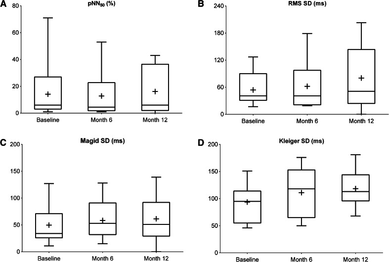 A phase 2, open-label study in 21 patients with non-Val30Met and non-Val122Ile hereditary transthyretin amyloidosis showed that tafamidis (20 mg daily for 12 months) stabilized these transthyretin variants. We assessed cardiac amyloid infiltration and cardiac abnormalities in this same study population. At baseline, median age was 64.3 years, 11 patients were in NYHA class II, 13 had conduction abnormalities, 14 N-terminal pro-hormone brain natriuretic peptide concentrations >300 pg/ml, and 17 interventricular septal thickness >12 mm. Mean (SD) left ventricular ejection fraction was 60.3% (9.96). Patients with normal heart rate variability increased from 4/19 at baseline to 8/19 at month 12 (p < 0.05). Cardiac biomarkers remained stable. Although four patients had increases in interventricular septal thickness ≥ 2 mm, the remainder had stable septal wall thickness. There were no clinically relevant changes in mean echocardiographic/electrocardiographic variables and no safety concerns.