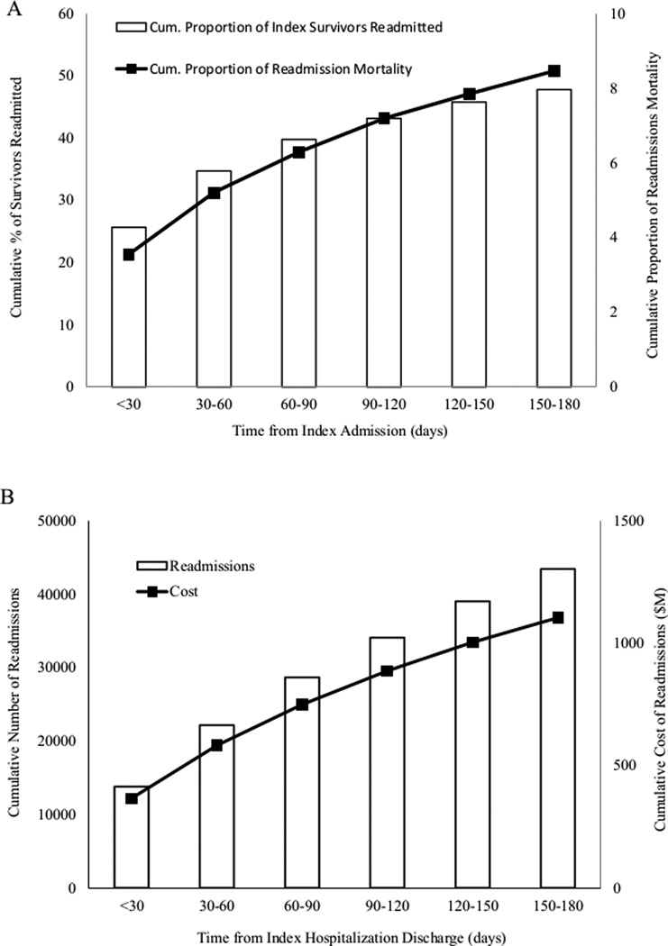 Conclusion: The 30-day and 180-day readmissions are common in sepsis survivors with significant resultant cost and mortality. Patient sociodemographics and comorbidities as well as index hospitalization characteristics are associated with 30-day readmission rates.